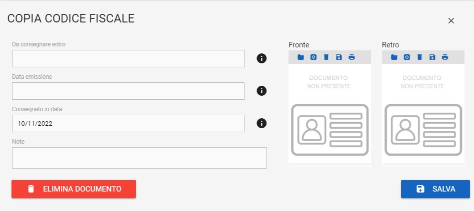 Inoltre nella sezione “Fronte” e “Retro” potrai acquisire le foto del documento selezionato così da porterle stampare quando necessario attraverso l’apposito pulsante.